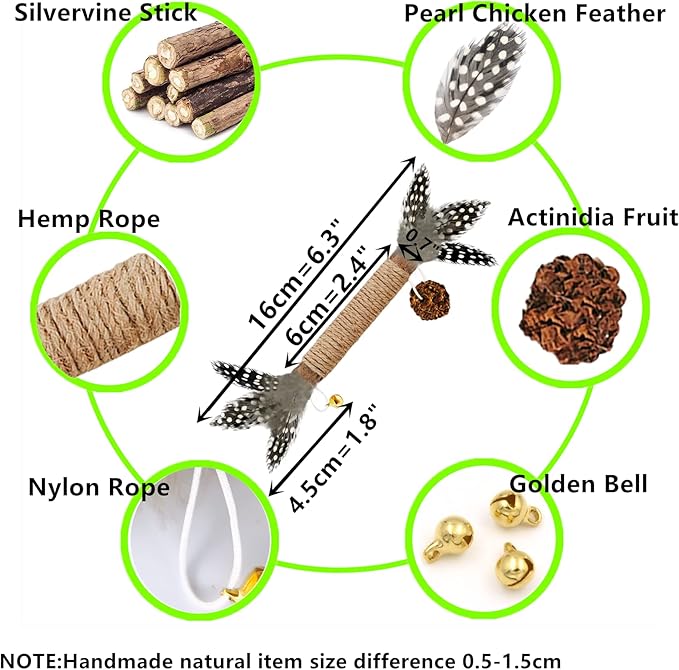 - 3.[Cat Teaser Toy with Feather]:This kitten treats for indoor kitten contains exciting durable string which makes cat chew toys for aggressive chewers more resistant to bites, dried & strong silvervine wood stick, cute kitten bell, lickable actinidia fruit. To increase the cat's interest in cat dental toy, we have added beautiful feather to teasing cat.Real fur will make cat very excited & playful, release the pressure in the process of playing & make the mood better.