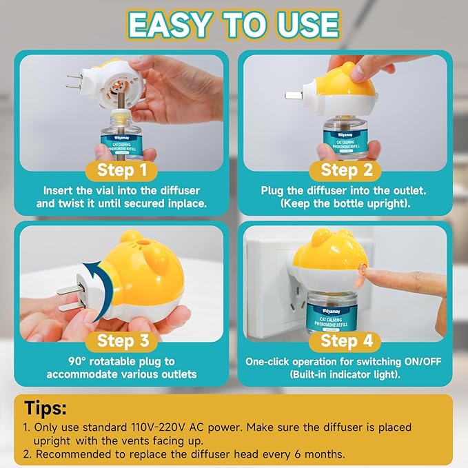 - Multifunctional Anxiety Relief: The Woyamay cat calming diffuser can help cats effectively alleviate anxiety and stress, reducing common stress signs such as scratching, urine spraying, conflicts between cats, meowing, fear, and reactions to new environments. It provides cats with comfortable sleep and a joyful daily life.