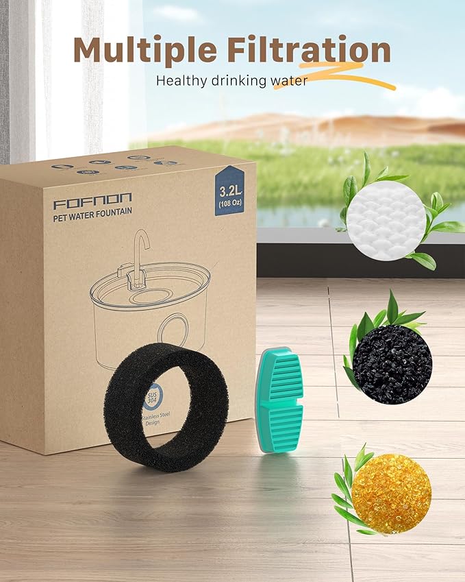 - 【Advantage: Excellent Service】We will solve the problems you encounter, please contact us. Search "FOFNON filter" and "FOFNON water pump" to find replacement parts.. Search "B0CLGPCNHN" for all metal automatic cat water bowl with 9 filters.