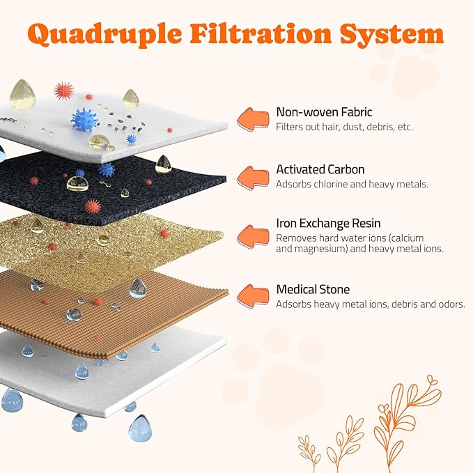 - [Quadruple Filtration System] The automatic dog drinking dispenser is equipped with an activated carbon filter, which removes odors and softens water quality. The filter captures pet hair, dirt, and food particles, providing fresh water for your pet all day long.