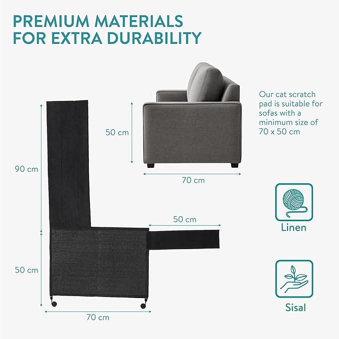 - SCRATCH & PLAY: Make your cat and yourself happy with this black sisal scratch mat for the right side of your sofa, couch or armchair. The mat provides a surface that deters cats from scratching furniture, rugs and carpets.