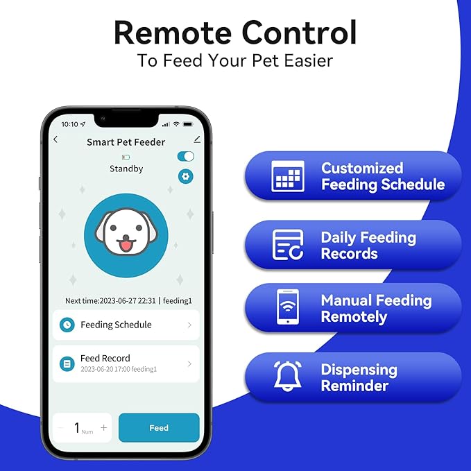 - 【SMART APP CONTROL FOR HASSLE-FREE FEEDING】PAPIFEED auto cat feeder (support 2.4G Wifi) can manually dispense food anytime and anywhere through the APP, and check the feeding record in real time. You can also customize a feeding schedule according to your pet's needs, accurately control the amount of each meal, and scientifically manage dietary health. Tip: When powered by a backup battery, the feeder will remain offline (unable to connect to the APP), but it will still strictly implement the preset feeding plan to ensure that your pet eats on time.