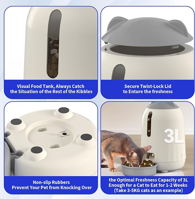 - 【SEALED MOISTURE-PROOF DESIGN TO KEEP CAT FOOD FRESH】The PAPIFEED cat feeder automatic not only has a built-in desiccant box + sealed grain bin, which effectively isolates moisture and prevents cat food from getting damp and spoiling. It also uses a knob-type bin cover design that needs to be manually rotated to open to prevent pets from scratching and stealing food, thus protecting food safety. From the first feeding to the last meal, it ensures that every grain of food eaten by your pet remains crispy.