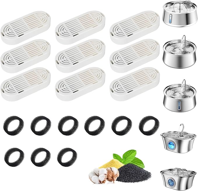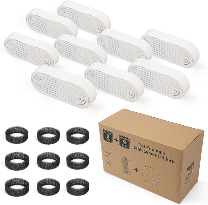- 【Package】Package includes 9 cat water fountain filters replacement and 9 pre-filter sponges.