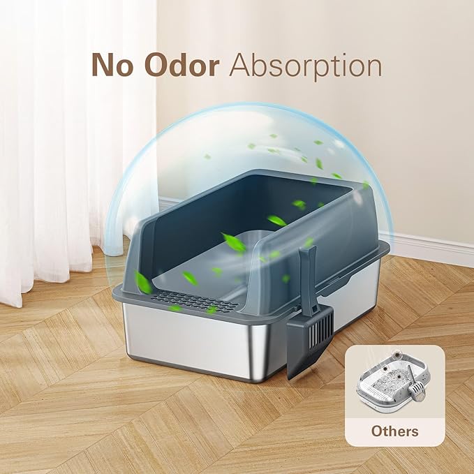 - 【Sturdy Stainless Steel Build】: Constructed from thick stainless steel for added durability, the stainless steel litter box is designed to withstand daily use, resisting rust and scratches from cat paws. The non-porous nature feature of stainless steel litter box also prevents odors from lingering, extending the lifespan and reducing the need for frequent replacement