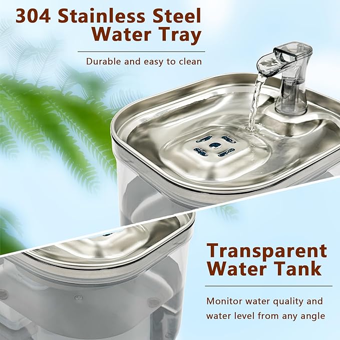 - 【Stainless Steel 304】Our stainless steel cat drinking fountain is made of food grade SUS304 stainless steel, equipped with a filter cartridges, ensuring effective filtration of impurities and elimination of odors. Now, your pets can not only have water to quench their thirst but also enjoy a healthy and happy drinking experience!