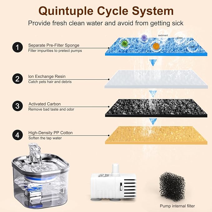 - 【Multiple Filtration Systems】Made of Pre-Fillter Sponge, Activated Carbon, Iron Exchange Resin, High-Density PP Cotton, our cat waterer fountain filter can effectively filter out hair, dust, debris and adsorb heavy metal ions and odors. With multiple filtration system, our cats and dogs feeding & watering supplies will provide clean and good-tasting drinking water for your pets all the time.