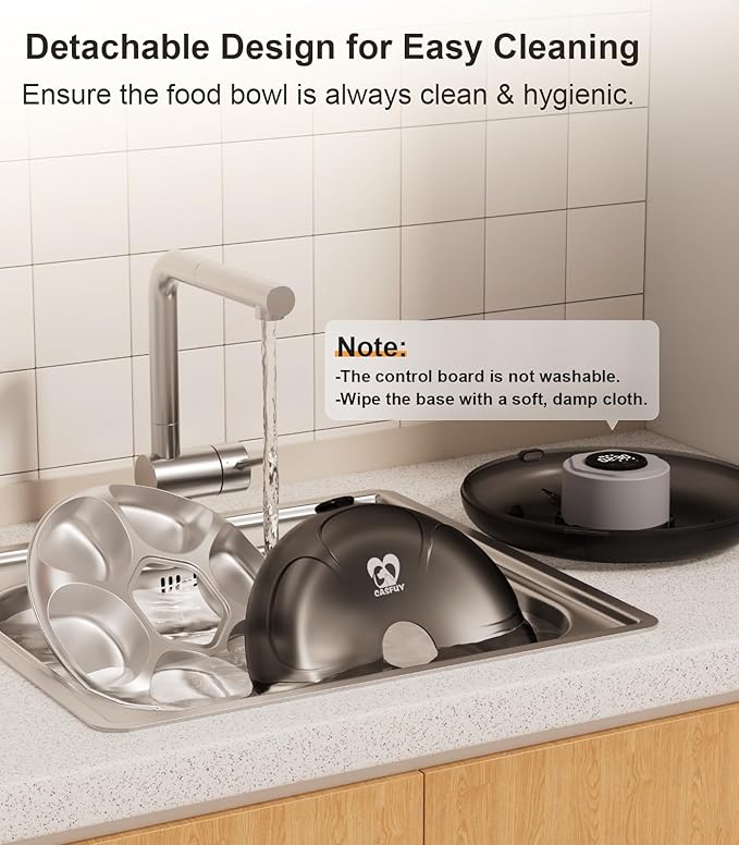 - 【Care for Your Pet's Safety & Health】These automatic cat feeders incorporate a paw-care design to prevent potential injuries. Crafted from food grade BPA-free ABS material, it prioritizes your pet's health. Both the top cover and food tray are easily removable for cleaning-simply rinse under running water. Note: Avoid getting the electronic components wet when cleaning.