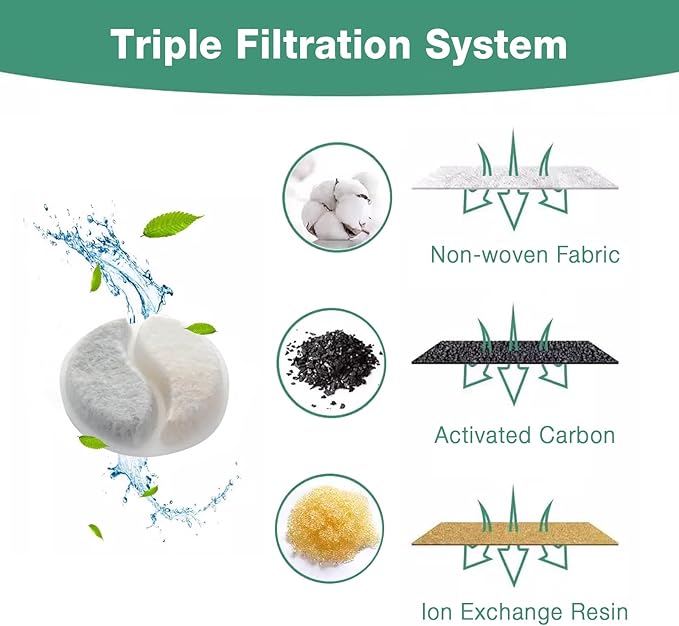 - To keep water safety, The four-layer filtration system composed of cat fountain filter and sponge can effectively filter out the impurities, remove the peculiar smell, soften the water quality, and improve the taste. This has greatly reduced the furry best friend risk of gastrointestinal and urinary problems.Let cats and dogs drink clear water at home and growth healthily. We don't need to worry about the hygiene of water fountain.