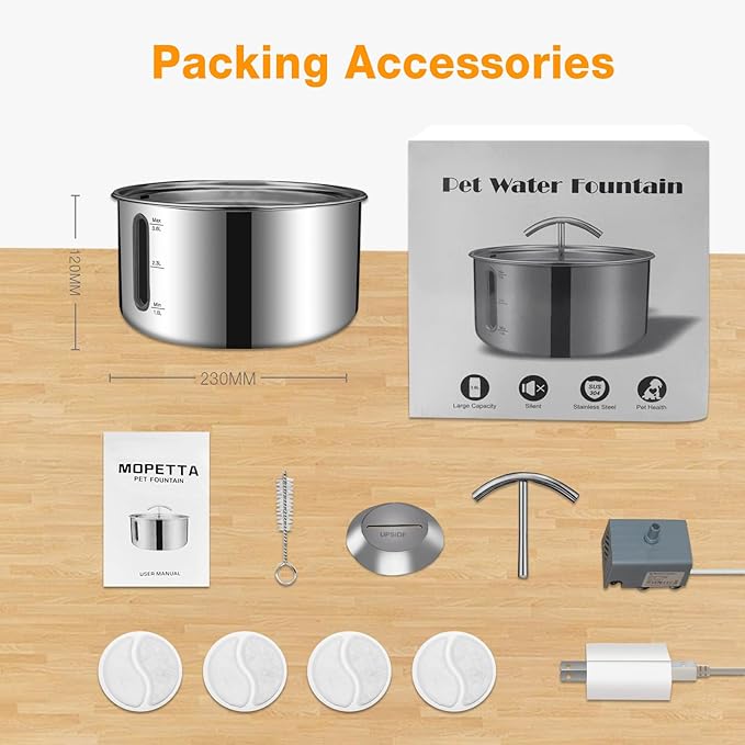 - Stainless Steel Cat Water Fountain: made from 18/10 food grade 304 stainless steel , BPA-free and dishwasher safe, easy to clean, which is also durable, safety and hygiene,it is more beneficial to the health of pets.