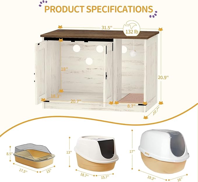 Cat Litter Box Enclosure, Hidden Litter Box Cabinet Furniture with Bell, Indoor Cat House, Farmhouse Style, 31.5 x 19.7 x 20.9Inches, for Hallway, Bedroom, Rustic Brown and White CB82414X