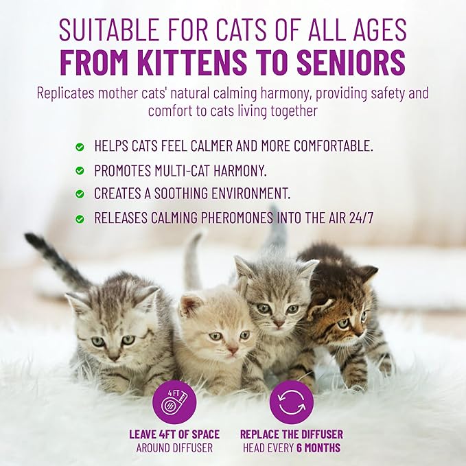 - COMPREHENSIVE STRESS REDUCTION - Eliminate stress related behaviors such as hiding, scratching, and spraying with our pheromone diffuser to calm cats, this cat calming pheromone diffuser transforms your home into a peaceful heaven, promoting positive behavior and strengthening the bond between you and your feline companion