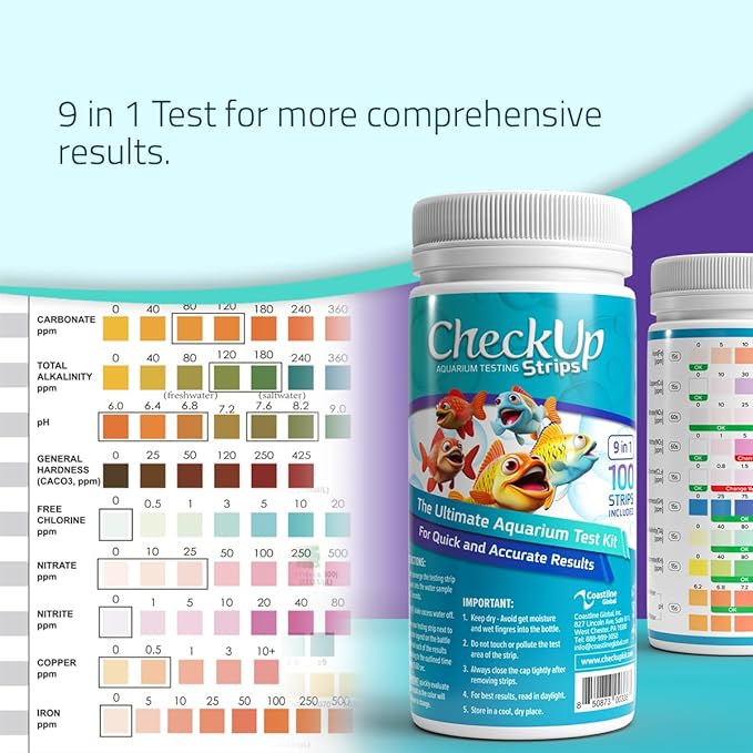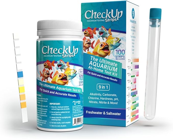 CheckUp Aquarium Test Strips | Test Kit for Freshwater, Saltwater, Pond, Fish Tank | 9 Parameters Test for Iron, Copper, Nitrite, Nitrate, Chlorine, Hardness, pH, Alkalinity and Carbonate | 100 Strips