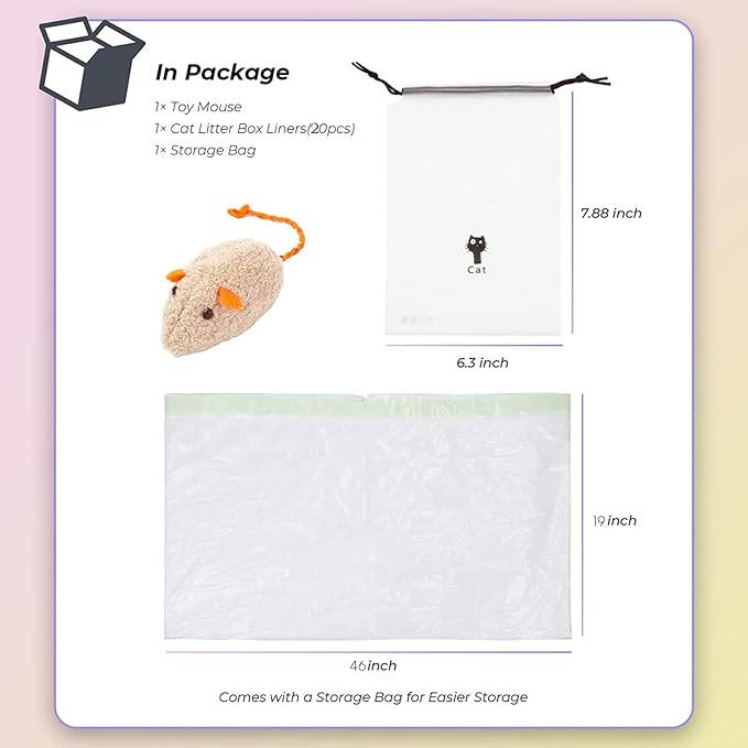 - Drawstring Design, Easy to Use: Self-clinching and leakproof cat trash bags make cleaning litter a cinch. No More Messes, No More Scrubbing, No Odor. When it’s time to change the litter, just lift litter bags ties, close and throw away. Cat owners can finish clean kitty litter box within 30S
