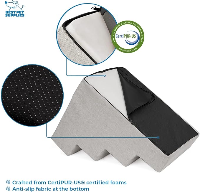 - PET-SAFE MATERIAL: Constructed with CertiPUR-US Certified Foam & proudly Made in the USA, these non-slip dog stairs for small and medium dogs provide safety for pets while being free from ozone depleters, PBDE flame retardants, mercury, and lead