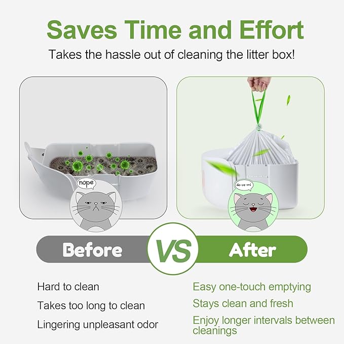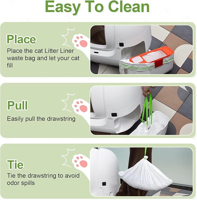 - 👃 🍃 NO ODOR AND NO DIRTY HANDS: Our automatic cat litter box liners come with a convenient drawstring closure to prevent litter spillage and odor leakage. Say goodbye to the messy cleaning process of cat urine or feces getting on your hands. Just pull and lift, and you can efficiently handle your cat's cleaning. Odor-free and touchless, that's Dranbol!