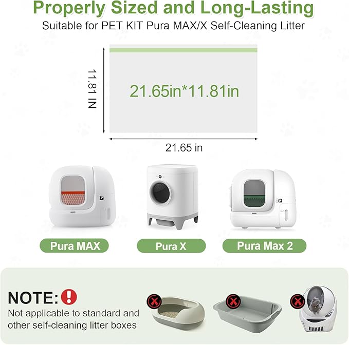 - 🐾 PERFET MATCH: Included in the package are 120 cat litter box bags measuring 21.65" x 11.81", perfectly matching Pet Kit PuraX PuraMax/Cleanpe*thome cat litter machines. Friendly reminder: 1. Correct size matching helps the machine run smoothly. 2. Before purchasing, please measure the size of your cat litter box drawer.