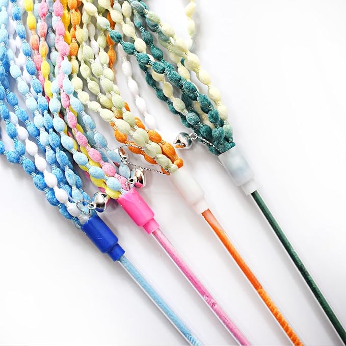 - Made by safe material. No feathers or small pieces to get lost or eaten. Colorful and long enough to have lots of cat play