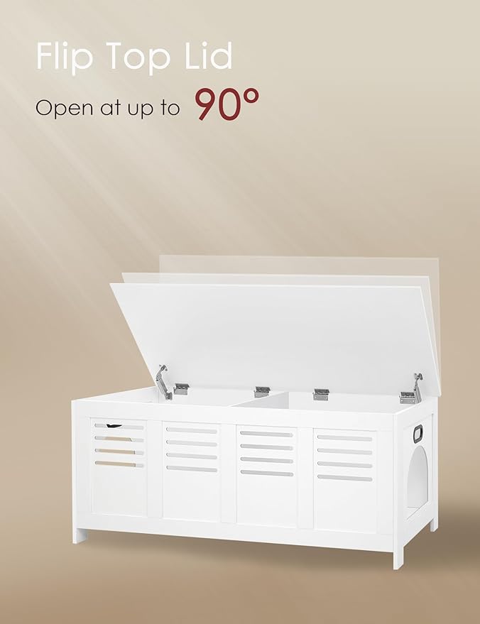 - 【High-quality Materials】The hidden litter box enclosure is made of solid particle board for safe and durable. An extra support leg is set at the bottom to enhance the firmness and stability. Flip top lid is equipped with 2 safety hinges which can stop at any position, effectively prevent cats from opening the door by mistake