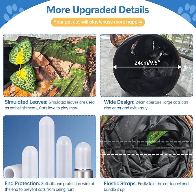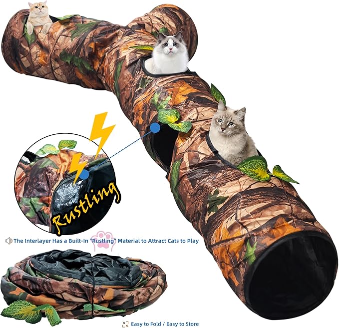 - 🐈【Rustle Joy】This new cat tunnel is made of a special fiber and coating that produces a rustling sound when cats pass through it, ensuring that it is both attractive to cats and safe and durable. This rustling design not only increases the fun of cats playing, but also provides an auditory stimulation that makes cats feel more excited and satisfied when exploring the tunnel. This design is especially beneficial for cats who live alone or indoors, as it helps them burn off excess energy and reduce potential anxiety and stress.