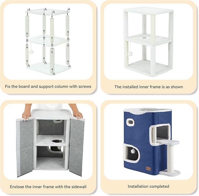 - Tri-Level Fun: Our 2-storey cat house offers two spacious cat bed caves that allow your pets to snuggle, and the upper platform functions as a perch for resting or a fort to survey surroundings; The pass-through hole facilitates unrestricted play between tiers.