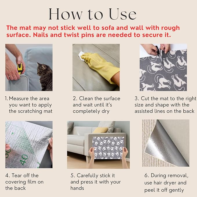 - Removable and Reusable: The cat scratching mats are easy to use, simply peel up the corner and gently remove, leaving no residue or mess behind. Reapply as needed.