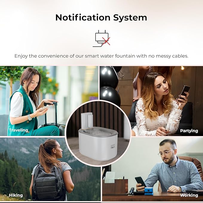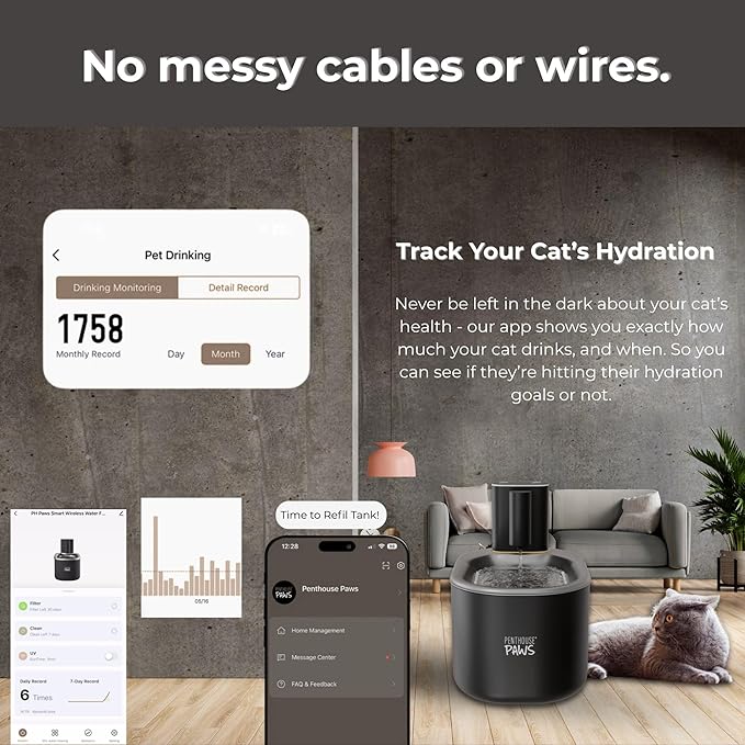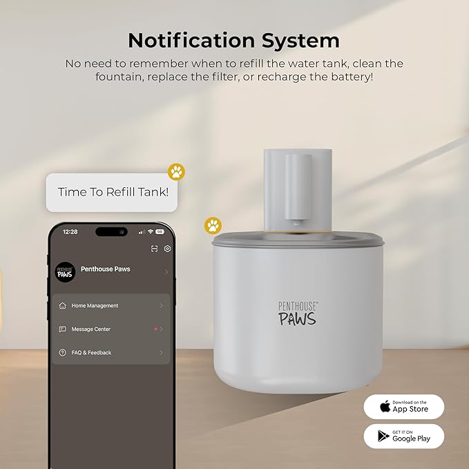 - Smart App Control & Alerts: Connect via WiFi to the Penthouse Paws App for real-time reminders to refill water, clean the tank, replace filters, or recharge the batter, ensuring your pet never runs dry.