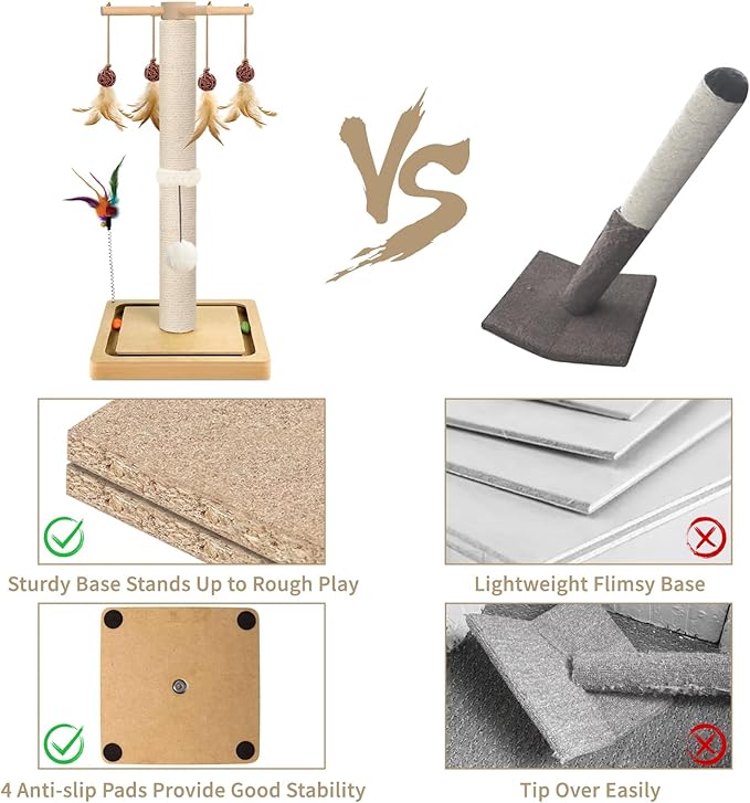 - 【STURDY BASE NOT EASY TO SHAKE】: The cat furniture is made of sturdy, thickened paper tube and wrapped in natural sisal, with a base made of sturdy, high-quality wood.The 1.2-inch thickened square base prevents the post from wobbling or toppling over during vigorous play, providing greater reliability and stability. Base comes with 2 interactive toy balls(one catnip ball).