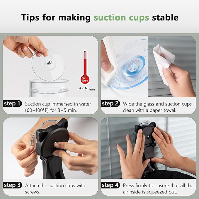 - [Pre-Installation Tips] To ensure the suction cups stick firmly to the window, soak them in hot water for 3 minutes to soften them. Dry them until they are just slightly damp, and clean the window. Apply the suction cups to the window and press firmly to squeeze the air.