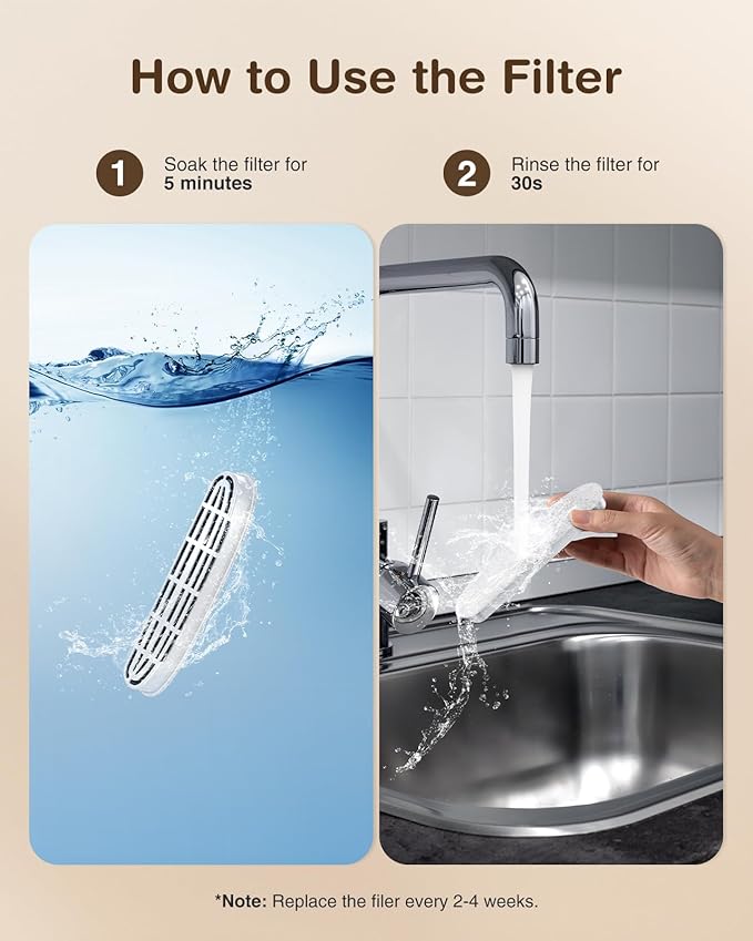 - Optimal use: Before use, soak the filter for 5 minutes or rinse for 30s. To maintain filtration efficiency and water flow rate, it is recommended to replace the filter every 2-4 weeks