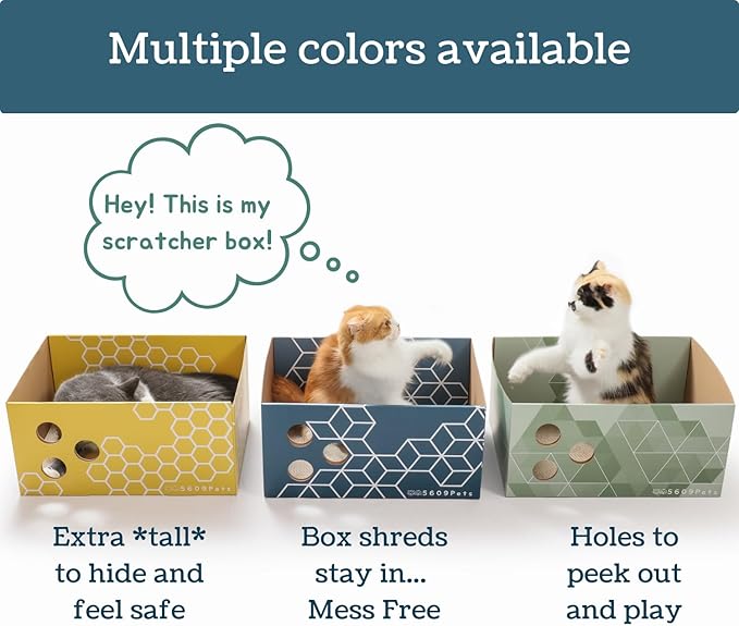 - [CATS LOVE BOXES, YOU LOVE NO MESS] Get rid of that boring shipping box, and get something cute *and* durable with specially designed peekapoo holes so they can play, hide, scratch, and sleep! BONUS… this scratcher keeps all the shreds in = NO MESS for you to clean up!