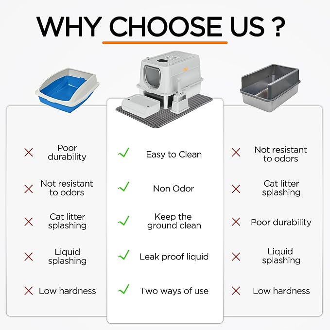 - Detachable Design--This litter box features a three-part detachable design, with both enclosed and semi-enclosed systems to meet the different needs of cats with various personalities. The snap-installation design aims to securely fix the shell and stainless steel litter box, Anti-leakage