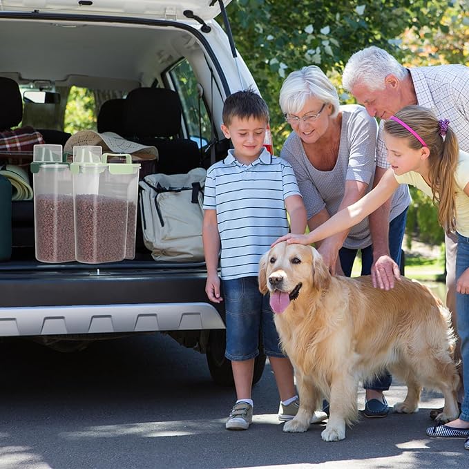 - FUNCTION : This airtight dog food container with portable handle has an airtight design,-has 2 silicone seals and 4 sealing buckles,which can keep your food dry and fresh, the portable handle and large spout design can easily Easily pours food out,also perfect for traveling, hiking, camping or picnicking with your dog