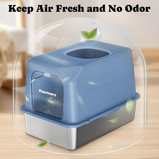 Pawtners Cat Litter Box, XL Extra Large Stainless Steel Kitty Litter Pan, Front Entry Top Exit Enclosed Metal Cat Toilet for Odor Control with Removable Lid & Scoop, Anti-Leakage, Easy to Clean, Blue