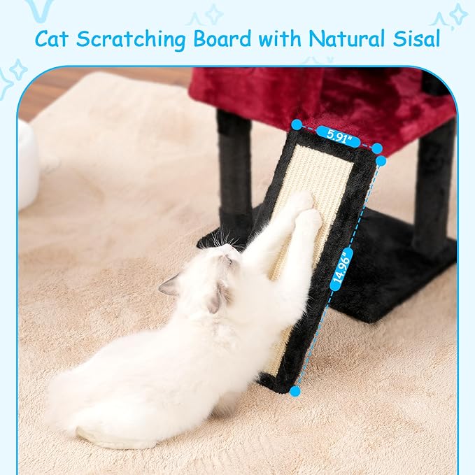 - PERFECT TO SCRATCH: The cat scratching board and posts are covered by natural sisal material which are harmless and also durable, not only satisfies the scratching instincts of felines but also protects the expensive furniture from sharpening claws.