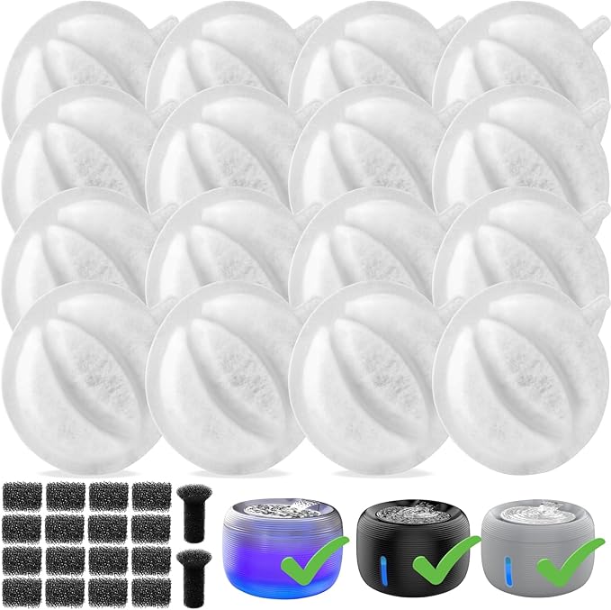 - 16+16+2 Pack Water Fountain Filters: You will receive 16pcs cat water fountain activated carbon filters, 16pcs pump sponges and 2pcs muffler sponges. The 16+16+2 pack is enough to meet the needs of your replacement. Each filter is individually sealed to keep its filtering quality not whittled even being long stored.
