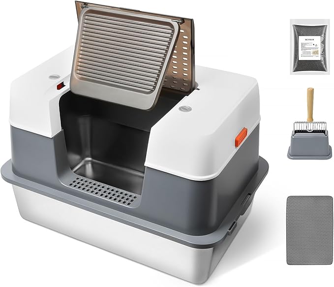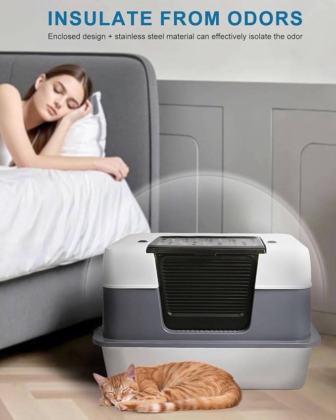 Stainless Steel Cat Litter Box Enclosed with Lid,Covered Metal Kitty Litter Box with Litter Mat and Odor Reduction Pack(2kg), Metal Scoop,Switchable Design, Easy Clean,Odor-Control, Leak-Proof