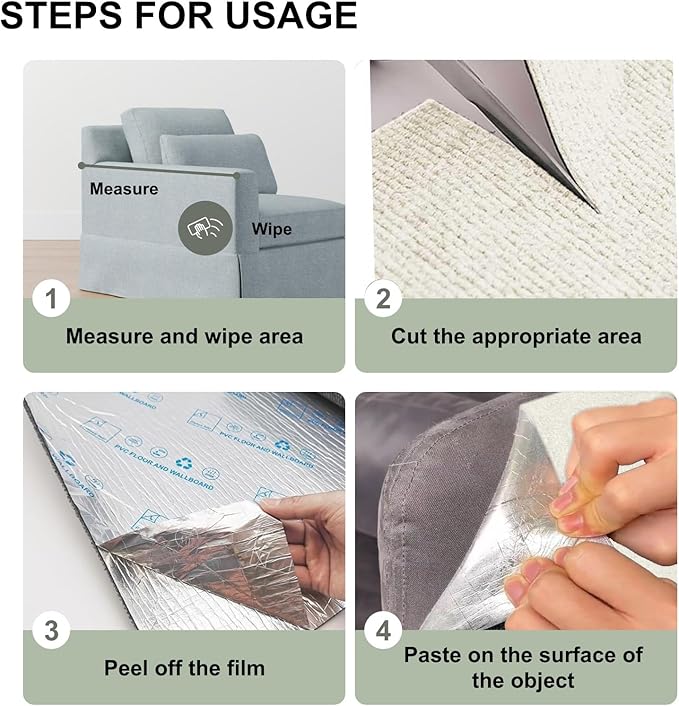 - [Easy to Use and Maintain]: Wipe and measure the pasting area first, (please do not use alcohol to wipe the surface, otherwise the product will lose its stickiness.) Cut out the required size, and then paste. Self-adhesive backing sticks easily to furniture. It is not easy to fall off even if it is scratched violently. Simply wipe or vacuum the cat hair off the mat when cleaning.
