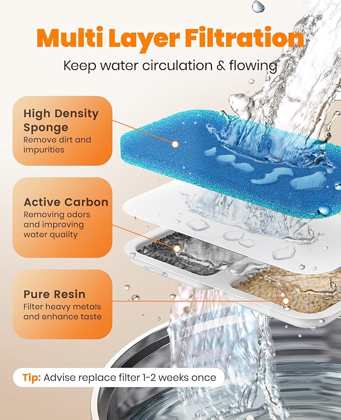 - Excellent Filtration System: oneisall cat fountains for drinking with 3 replacement activated carbon filters, every drop of water removes all impurities, providing better tasting water, ensure that your cat's water is always pure and fresh