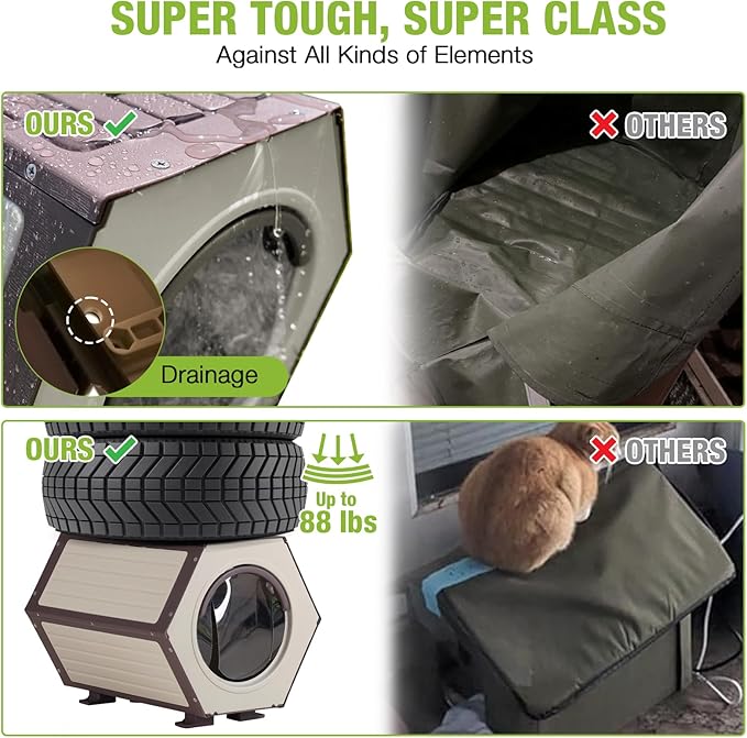 - Two-Leg Options And Escape Door: The heated cat house is super easy to assemble with both short and long leg options, giving you flexibility in setup. A rear escape door that allows your cat to exit safely, ensuring cat's security