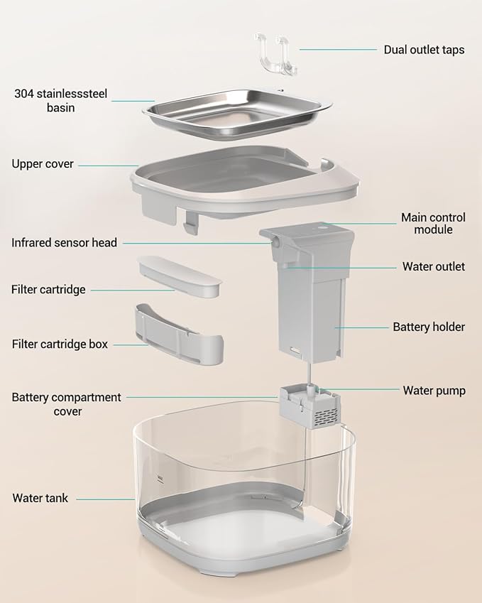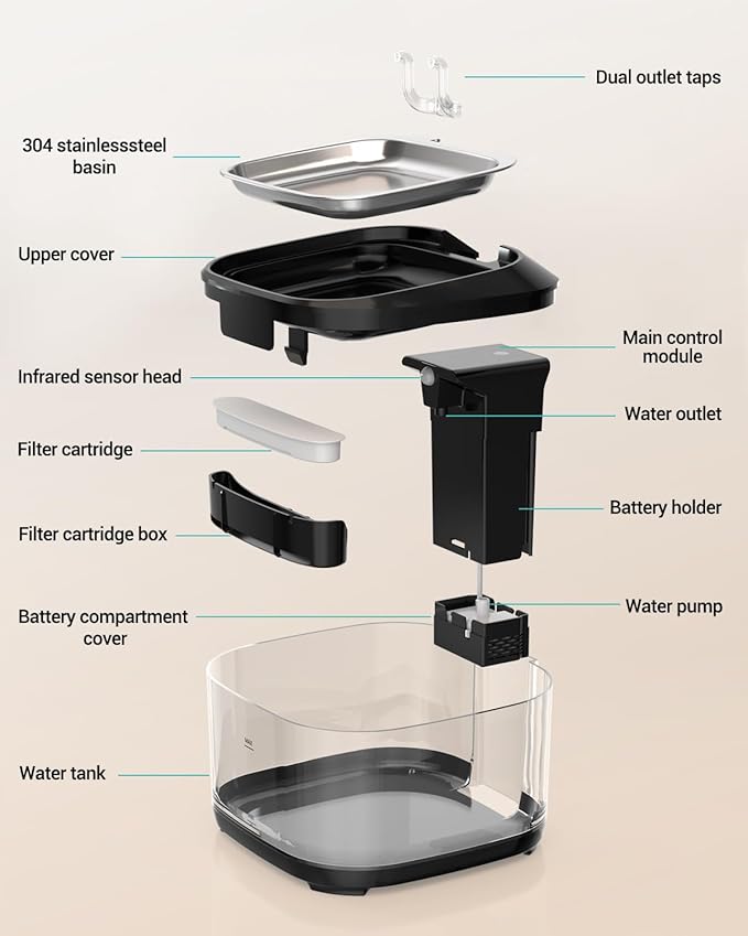 - 6-Stage Filtration: Non-woven fabric, double activated carbon, ion exchange resin, and double high-density sponge work together to filter out fur and impurities, eliminate odors, soften water quality, and purify heavy metals