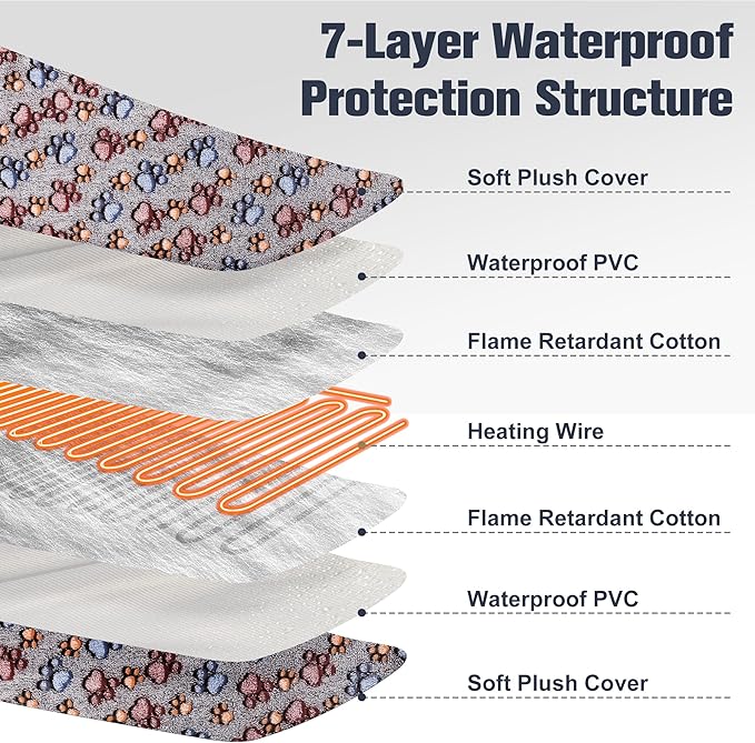 - 7-Waterproof Layer Protection Structure: Our Cat warm bed mat features a 7-layer protection structure, ensuring the safety and security of your beloved pets. with MET-certified heating wire protect pets from burns. The PVC inner with waterproof and flame-retardant function