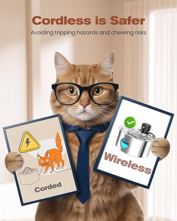 - New Pet Drinking Experience: The battery operated pet fountain offers fresh drinking water anywhere without cords, whether in the playroom, kitchen, living room, or windowsill. It encourages your furry friends to drink more while avoiding tripping hazards and chewing risks, ensuring safe hydration.