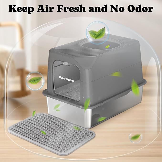 Pawtners Stainless Steel Cat Litter Box, XL Extra Large Enclosed Kitty Litter Pan, Front Entry Top Exit Hooded Metal Cat Toilet for Odor Control with Removable Lid & Scoop, Anti-Leakage, Easy to Clean