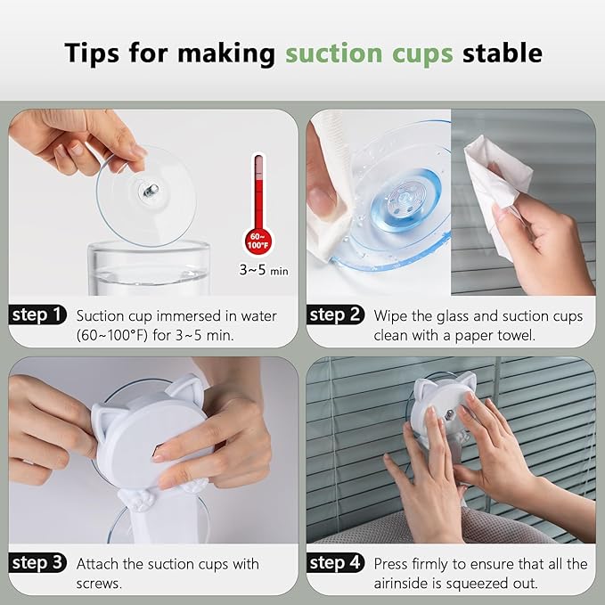 - [Pre-Installation Tips] To ensure the suction cups stick firmly to the window, soak them in hot water for 3 minutes to soften them. Dry them until they are just slightly damp, and clean the window. Apply the suction cups to the window and press firmly to squeeze the air.
