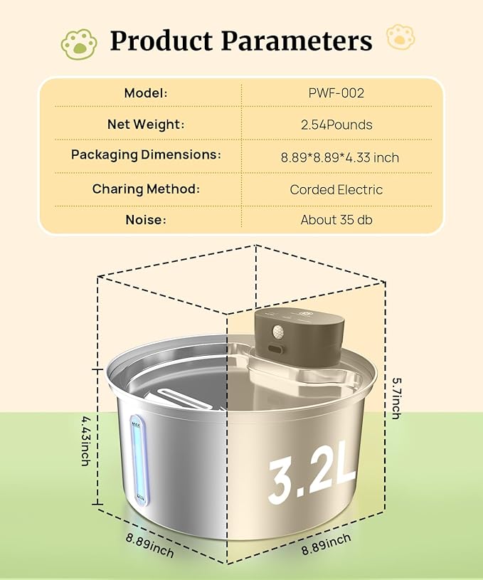 - 【Premium 304 Stainless Steel】Made from premium SUS304 stainless steel, this pet water fountain is rust-resistant, BPA-free, and built to last. Its sleek, modern design fits seamlessly into your home, and it’s easy to clean—ensuring your pet enjoys the freshest water, every time. We recommend cleaning the water pump every 2 weeks to prevent it from getting clogged with cat hair.