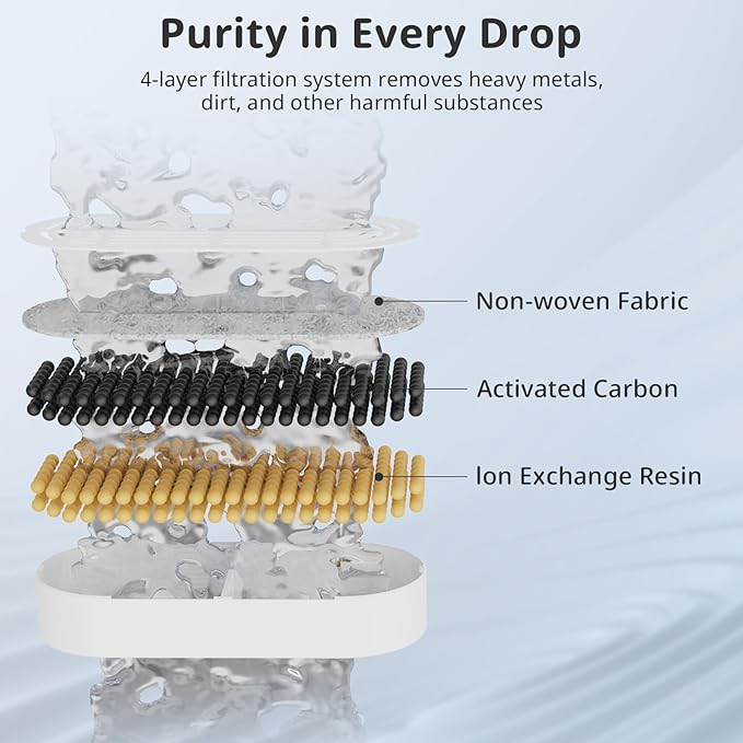 - Filtration System: The replacement filter has a multi-layer filtration system.High density cotton can Stop hairs and debris;Activated carbon can remove bad taste and odor;Filtration stone can remove heavy metals and release trace elements;Ion exchange resin can soften the tap water