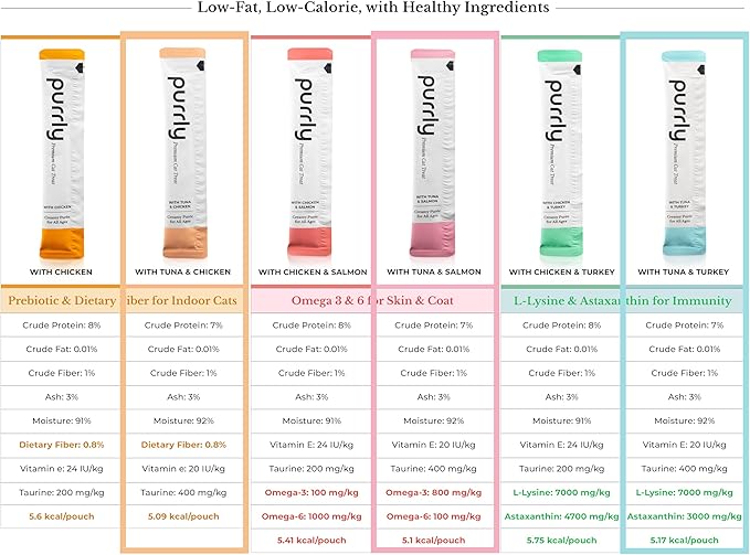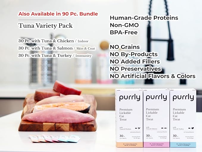 - HUMAN-GRADE PROTEIN SOURCES - Purrly uses only human-grade meat and fish as the primary protein source, exceeding industry standards and ensuring exceptional taste and unmatched nutritional value for your cat. These exquisite treats elevate snack time beyond ordinary treats, offering a truly gourmet experience that satisfies your feline's discerning palate. Each pouch serving unparalled quality and nutrition.