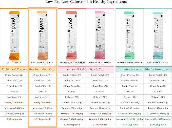 - HUMAN-GRADE PROTEIN SOURCES - Purrly uses only human-grade meat and fish as the primary protein source, exceeding industry standards and ensuring exceptional taste and unmatched nutritional value for your cat. These exquisite treats elevate snack time beyond ordinary treats, offering a truly gourmet experience that satisfies your feline's discerning palate. Each pouch serving unparalled quality and nutrition.