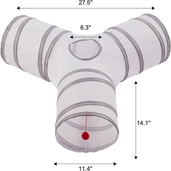 - SIZE AND MATERIAL: The 3 way cat tunnel expands to about 11”(27.94cm) tall x 19” (48.26cm) long and folds down to a fraction of that size.Include 1pcs cat tunnels.This cat tunnel is made of Nylon for indoor cats. Nylon wrapped around a sprung-steel frame.With an interior diameter of 11 inches.